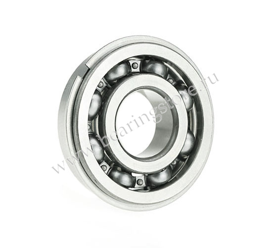 Подшипник качения шариковый радиальный однорядный открытый. Канавка под стопорное кольцо на наружном кольце с установленным стопорным кольцом. |
